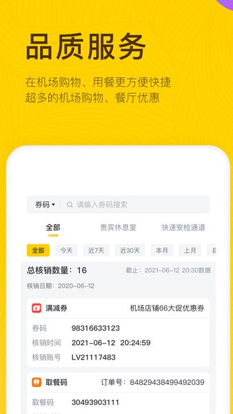 【贵宾服务】支持全国机场贵宾休息室,机场快速安检通道核销服务;