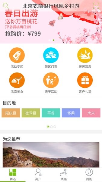 凤凰乡村游客户端是北京农商银行打造的京郊旅游软件,让用户可以获得更多的旅游线路,通过软件可以让用户发现更多的旅游景点,帮助用户周末进行京郊游玩更加方便。