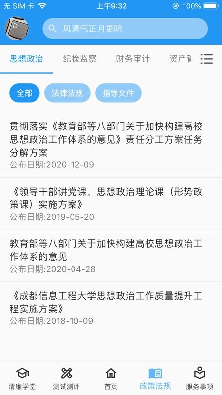 清廉校园是针对高校用于清廉教育宣传、学习和在线考试的新媒体平台,由清廉学堂、政策法规、服务事项、专项考试四部分组成。清廉学堂提供相关知识点学习;政策法规提供国家、高校的法律法规查看;服务事项展示高校提供的服务的办理时间、地点、材料、流程等相关信息;专项考试采用自主组卷、特定人员参加的考试模式,为相关人员考核提供帮助。