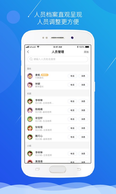 人员管理:建立班级关系链,统一管理各班级老师、家长及幼儿,让幼儿园管理更高效省心。