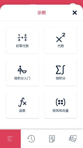 4.提供了大量智能计算器,包括:方程、联立方程、不等式、积分、导数等;