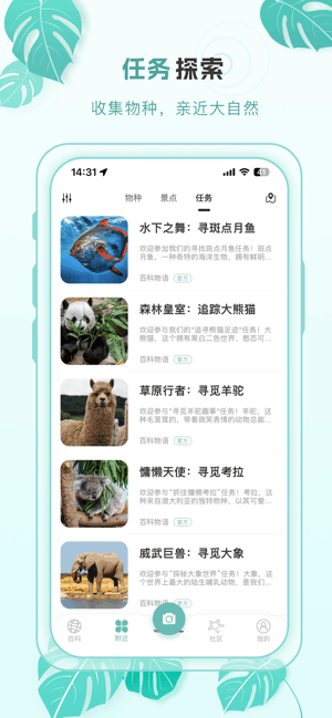 在\"百科物语\"中,你可以探寻世界各角落的生物多样性,感受大自然的真实呼吸。无论你是一位热血探险家,抑或是生物爱好者,甚至是对大自然抱有无尽好奇的人,\"百科物语APP都可以满足你。你可以参与我们的物种任务,享用AI物种识别功能,聆听生动的语音科普,浏览自然新闻频道,甚至可以借助我们的物种鉴定服务,深度探索生物世界,感受自然的无比魅力。\"百科物语\"期待与你一起,共同揭开大自然的神秘面纱,探索生命的无限可能。