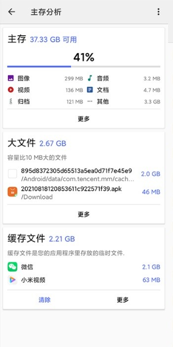 主存分析:有时候手机存储容量不知道被什么文件占用了,可以通过主存分析功能进行分析,会列出大文件和缓存文件,点击 "更多" 按钮,可以看到会按大文件/文件夹来排序。
