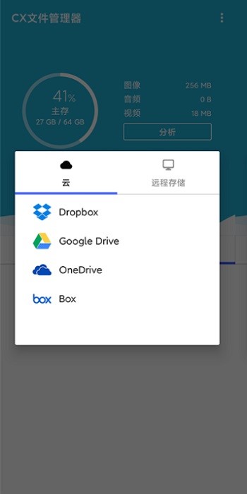 cx文件管理器可以支持连接到各种常见的局域网共享电脑 (smb),支持 ftp、ftps、sftp、webdav 等远程服务器;同时,也可以支持 onedrive、dropbox、google drive、box 等主流的网盘文件管理。