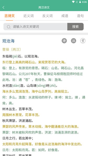 大文学软件是专门提供各种文学诗词作品的阅读平台,界面十分简单,古诗文、近反义词、成语、造句、作文、诗词等内容应有尽有,一键查询直达,可以随时阅读查看,丰富大家的文化知识,提升文化素养,适用于各种学习场合,操作简单又快捷!