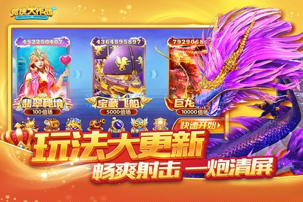 《竞技大作战》是一款超好玩的捕鱼游戏,画面超级华丽,3D效果特别震撼,各种鱼和BOSS种类超多,玩法特别丰富。支持多人在线竞技,还能和朋友一起打BOSS,感觉超刺激!游戏里有各种技能和特效,比如冰冻、炸弹什么的,玩起来特别爽。还有自动射击和锁定大鱼的功能,简直是捕鱼爱好者的天堂。福利也特别多,每天都能领金币,还有各种活动和奖励,完全停不下来。