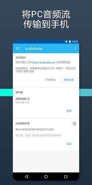 audiorelay apk是好用的手机音频扬声器工具,通过pc、手机安装软件,在同一个局域网环境下,可以将pc音频流传输到手机,将手机变成无线扬声器,当做电脑的外置音响,低延迟声音,快速进行播放,完全没有广告骚扰,操作简单易上手!