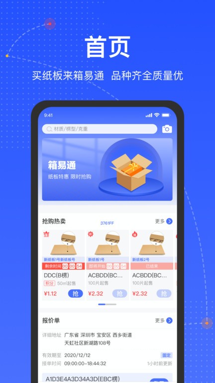 箱易通app最新版主要提供材料采购服务,这里有各种纸板,可以查看详细的售价信息,支持在线抢购,提供了团购服务,优惠更多,能够查看所有的订单物流进度,还能进行分厂、员工以及发票的管理。