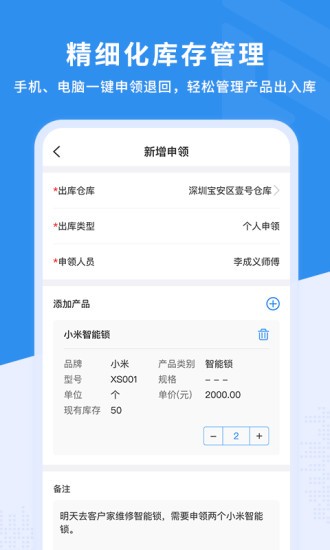 新售后软件备件库存管理,备件出入库管理,员工领料退料,网点备件调拨。