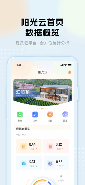 阳光商务云app是阳光家庭光伏智能云平台专门针对家庭光伏用户推出的一款移动端解决方案,用户通过应用可以方便、快捷的进行项目、订单、用户的管理;通过应用亦可管理自己的电站信息,如发电、收益、监测、工单等。