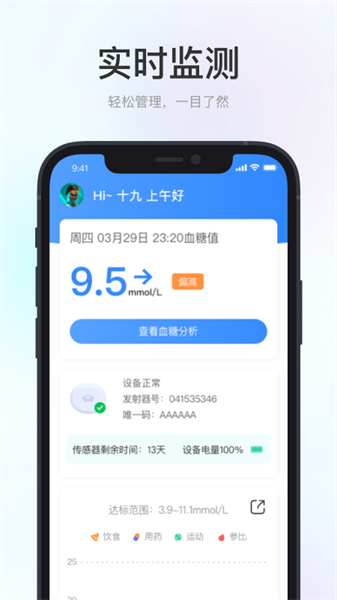 用户连接设备和软件之后,就你可以实时进行检测,对自己的血糖信息进行一个监测看,查看自己的健康状况,及时获取相关数据,避免出现其它问题.