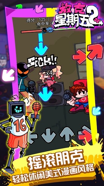 《放克星期五2》是一款挺有意思的音乐节奏手机游戏,画面设计很有美式漫画的感觉,角色很多,解锁起来还挺有成就感。游戏节奏感很强,操作简单又灵活,玩起来轻松有趣,特别适合喜欢休闲娱乐的朋友。