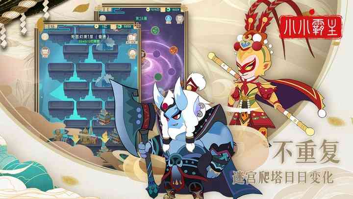《小小霸主》是一款充满国风特色的手机游戏,融入了京剧等传统文化元素,让玩家在游玩的同时也能感受到中国文化的魅力。游戏的画面设计非常精美,采用Q版卡通风格,角色造型趣味十足,既有传统的国粹韵味,又加入了现代年轻人喜欢的时尚感。