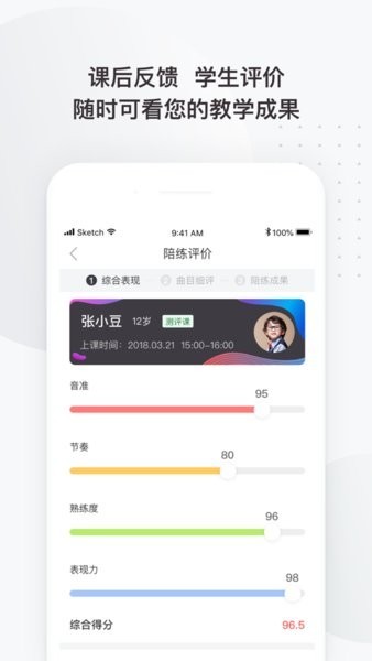 陪练老师每节课后专业点评,有针对性地指出孩子练琴问题并及时调整孩子个性化教案,帮助孩子真正实现高效练琴,也便于家长监督与了解孩子练琴进度。