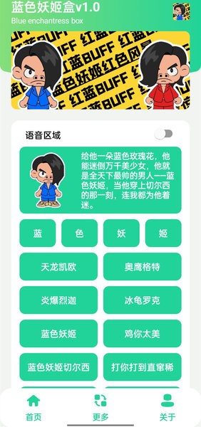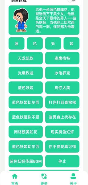 蓝色妖姬盒是一款经典的语音盒子app,和以前很火的鸡乐盒、夹音盒类似,操作简单,点开就能用,特别适合喜欢恶搞的朋友。它有很多有趣的语音包,涵盖各种网络热梗,比如“别踩我的切尔西”,特别魔性!而且这些语音都是免费的,随便下载使用,完全不用担心费用问题。