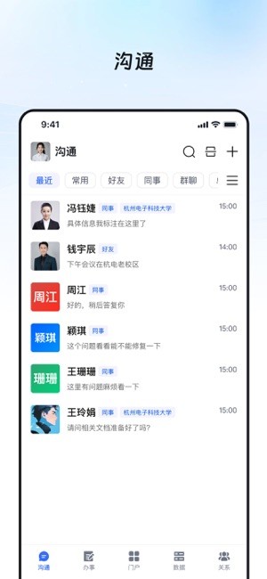 支持个人和组织的关系的建立,好友和成员的管理,家庭、群组、单位、部门、集团等各类组织形态的构建,快速将工作和业务关系数字化、在线化,支持灵活的权限、角色和岗位管理等不同颗粒度的访问控制功能。