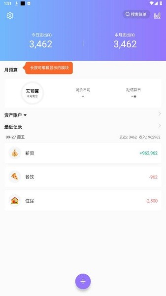 -- 然后就是最近的账单记录了,下面有一个醒目的添加按钮,点击加号,就可以记录新的一笔账单了。