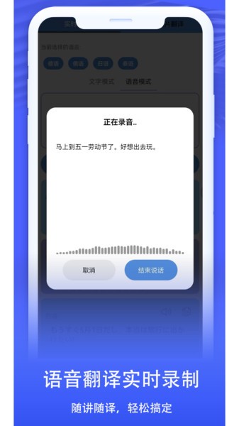 流利语音识别,随说轻松讲语音识别为文字,并自动翻译成为您期望的目标语言。可识别方言,准确率高,翻译结果质量高。