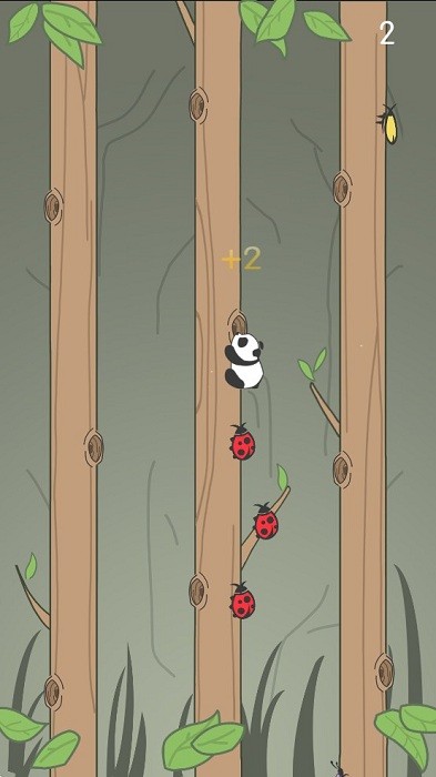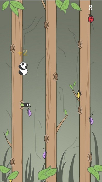 2,熊猫会不断地向上爬树,随着游戏进度拉长,虫子会越来越多,碰到虫子就会从树上掉落哦;