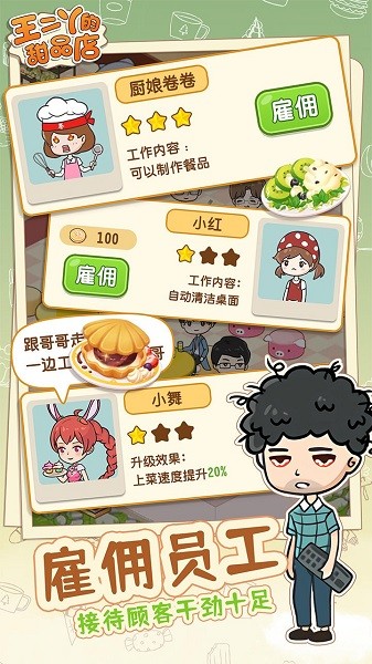 王二丫的甜品店最新版是一款好玩有趣的模拟经营甜品店的手机游戏,画风画面精美可爱,玩起来趣味十足,老少皆宜,可以轻松上手。各种甜品美食配方随你解锁制作,还可以雇佣员工服务顾客,邂逅更多浪漫,短信交流甜蜜互动,可谓是工作爱情两不耽误!