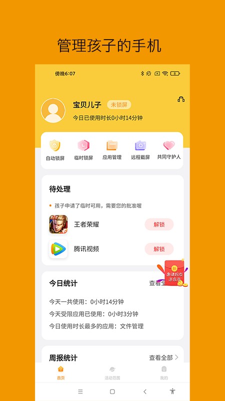 以后就可以锁定孩子手机的娱乐应用,让孩子可以不再学习的时候使用娱乐应用