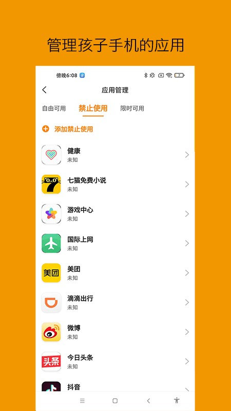 悟空守护家长版app是供家长使用的孩子手机上网管理软件,家长可以查看孩子每天使用手机的时长,每个应用以及游戏所花费的时间,可以设置孩子每天可以玩手机的时长,上学日以及休息日可以分开设置,能够对部分的游戏和应用禁用。