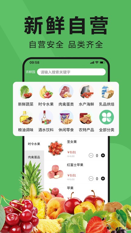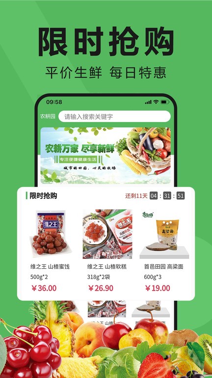 农耕园app最新版汇集了丰富的农产品,蔬菜水果、水产海鲜、鸡鸭鱼肉、调味品等一应俱全,分类详细,产品非常齐全,覆盖面极广,产地直供,新鲜健康,每天还有限时优惠特价生鲜产品等你来抢哦!