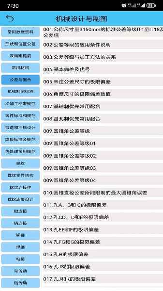 常用数据资料、形状和位置公差、表面粗糙度、公差与配合、常用材料、机械制图标准、冷加工标准规范等