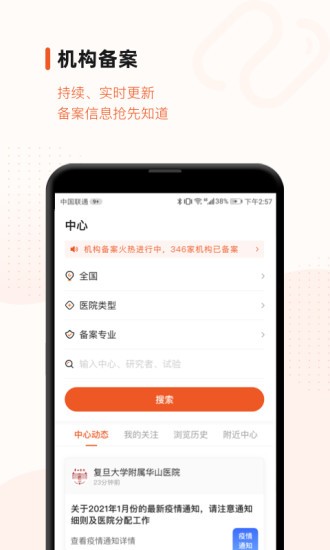 1、根据地点、医院类型、认证专业、研究者等即可搜索相应的机构;