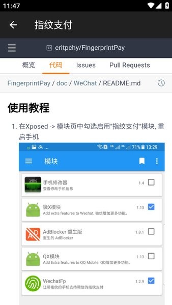 1.在Xposed ->模块页中勾选启用"指纹支付"模块,重启手机;