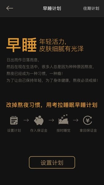 1.用户可以设置合适的早睡计划,以后就能按时睡眠