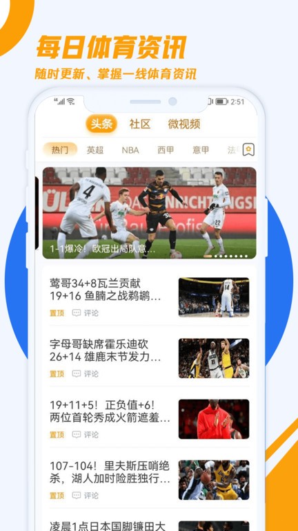 海量体育赛事资讯,视频实时推送,24小时欢乐不断。