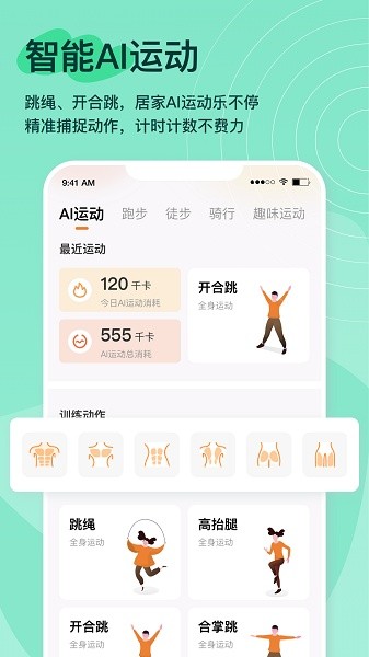 提供高抬腿、开合跳、深蹲、俯卧撑、仰卧起坐等丰富的动作库,按部位坚持训练可锻炼到全身肌群;AI自动识别每一次动作的精准度并评分,运动结束会实时生成时长、卡路里消耗、分数高低等数据,更有AI花样跳绳,告别场地、时间限制,居家运动即可拥有“健身房”效果。