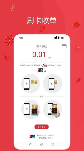 3、刷卡支付,银联金融级安全保护,让商家在自己手机上即可实现银行卡、手机 PAY 收款。