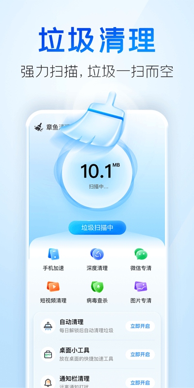 章鱼清理大师app是一款专注安卓用户的专业手机清理工具,使用先进的垃圾扫描引擎,释放手机存储空间和内存,解决卡、慢、耗电等问题。