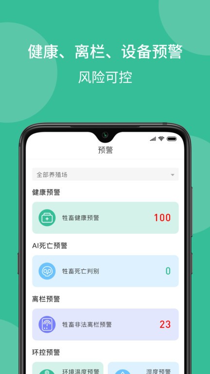 【预警】:健康预警、离栏预警、环控预警,设备预警,为养殖企业提质增效。