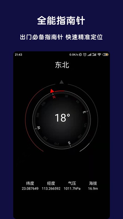支持海拔、气压、磁场强度、实况天气等专业户外指南针功能;