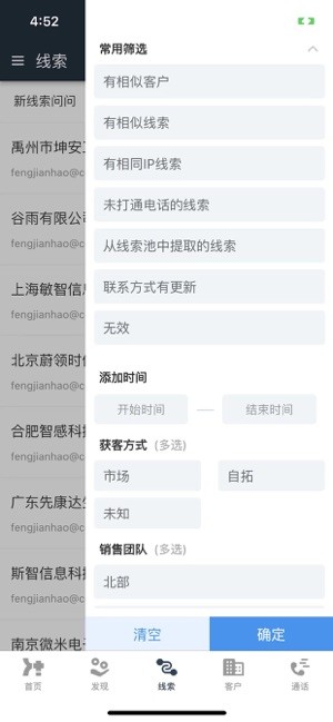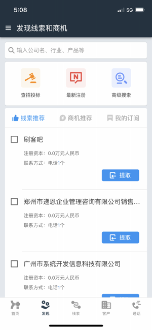 提取后,线索就会从系统的“找线索”进入“线索管理”,到这里我们就完成了找客户的工作。如果是企业用户,系统会有线索保护,一条线索不可多人提取,避免撞单,也可以由管理员统一提取,再进行分配。