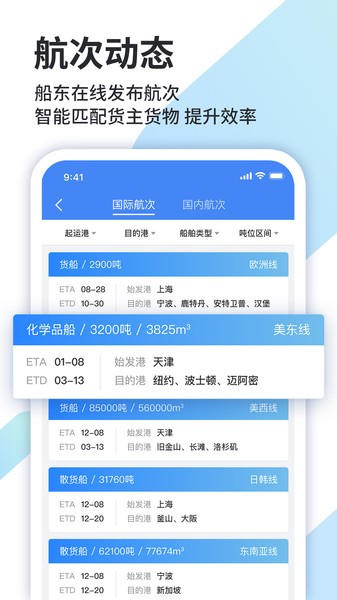 船东可在线发布自己的航次,智能匹配货主货物,减少国内、国际海运运输空载率,提高航运效率。