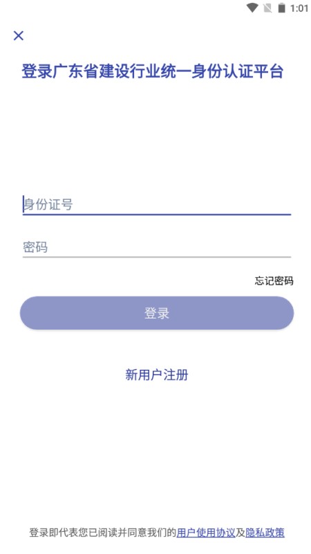 账号注册请打开“粤建通”APP,点击主页页面的【新用户注册】,根据实际情况进行注册。