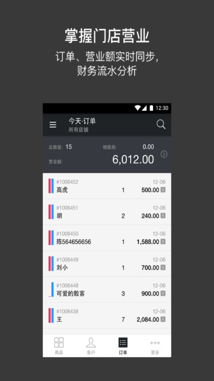 2.商品管理,客户管理,员工管理,采购进货,仓库管理,库存分析,财务流水,经营分析,订单管理,欠款管理以及收银记账于一体,节省会计人员成本,随时随地查看收银。