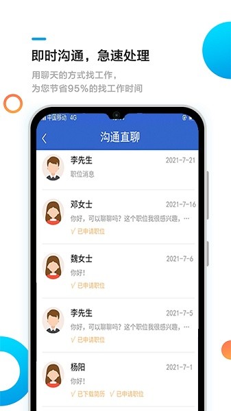 即时沟通,极速处理,可以用聊天的方式去找工作
