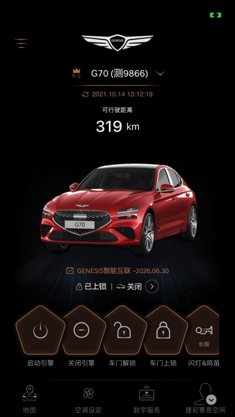 捷尼赛思智能互联手机版是一款提供车辆管控服务的智能控制软件,可以实时监控车辆状态,一键远程操控,开关锁十分方便,支持地图导航、空调设定、360全景等功能,随时随地掌控您的爱车,让你放心使用,一切尽在掌握,安全驾驶,便捷出行!