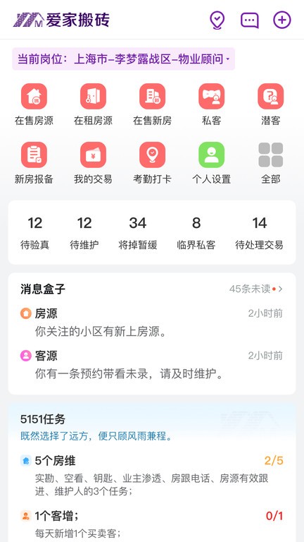 爱家搬砖手机版为房地产经纪人所提供的一个可以管理客源的移动办公助手。用户可以在这里查询可推荐房型,与客户在线实时沟通,解决他们提出的需求,为后续客源跟踪提供有力支持,具体功能有需要的用户不妨来了解更多。
