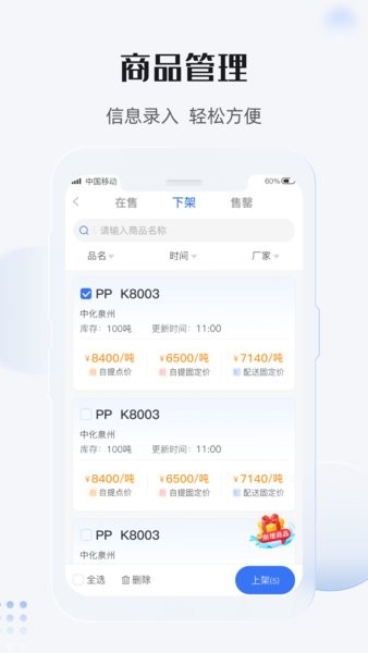 最有料商家版是专为塑化供应商提供的交易管理平台,主要能提供商品管理、实时报价、客户画像管理、订单进度实时提醒,经营数据复盘、员工管理、物流资金服务等。通过借助平台千万级流量和数字化工具,可快速增加销量和客源,让业绩翻番。