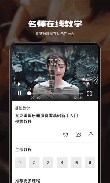 尤克里里教学app,一个专门为尤克里里爱好者们打造的在线学习软件,这里有大量的曲目提供给大家练习学习,也有专业的老师在线指导教学,让你直接在手机上就能自学尤克里里,且知识都是系统全面的,有需要的朋友快来下载使用吧~