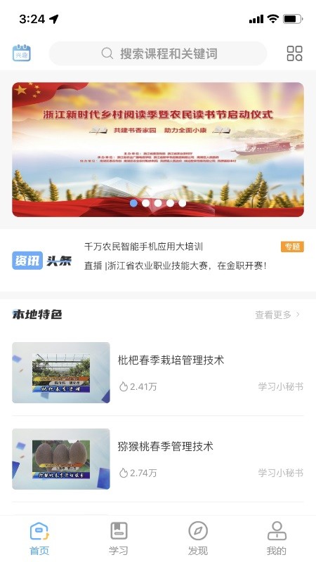 浙农云app专为浙江地区的农民打造了培训学习服务,有非常详细的开班公告,用户可以按照开班时间来在线学习课程,在我的培训班里面可以看到累计学时、观看时长、完成度等数据,可以发出培训申请,能查看历史浏览记录!