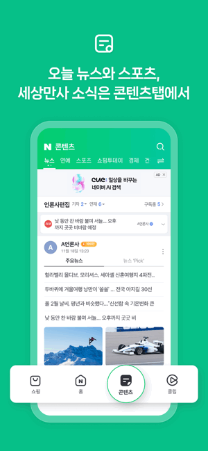 NAVER应用程序根据内容类型提供4个空间。每天查看的信息是“主页”,短而快的短款是“剪辑”,新闻和各种可读的“内容”,