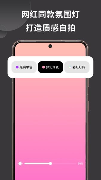 彩虹氛围灯一款简单的拍摄补光灯!我们将您的手机屏幕变成一个简单的氛围灯,您可以随时调整颜色以及明亮度让你不再为打光而焦虑!在彩虹氛围灯,不仅可以自己选择专属颜色,还为您提供了创意颜色。彩虹灯阵更是让您在家即可享受一场美妙的灯光秀。