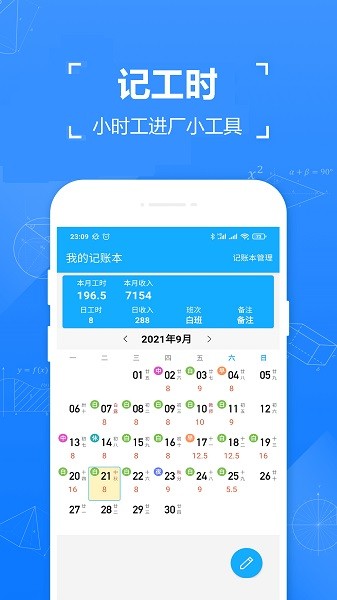 1、快速记工时:设置好小时工资后,每天记录工时,就可以自动帮您计算工时收入